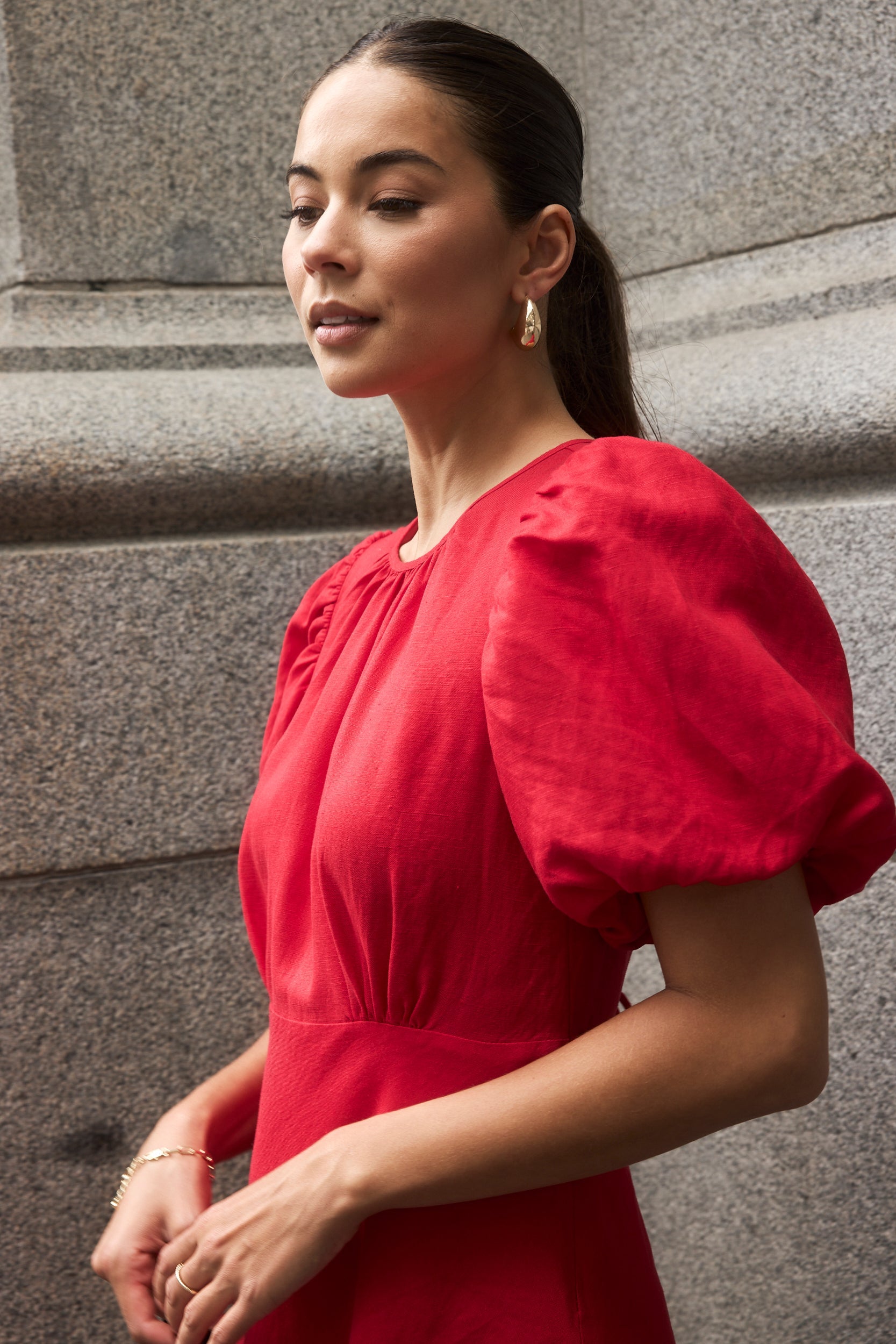 Make a bold statement in the Stage Cherry Dress, a stunning piece that blends timeless elegance with a modern silhouette. Designed in a rich cherry red, this dress features dramatic puff sleeves and a flattering fitted waist that flows into a graceful maxi-length skirt. The breathable linen-viscose blend ensures comfort while maintaining a structured yet effortless look.