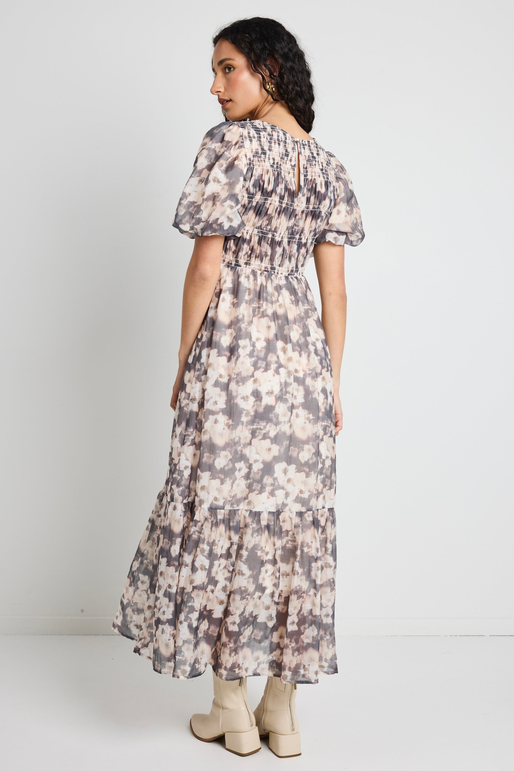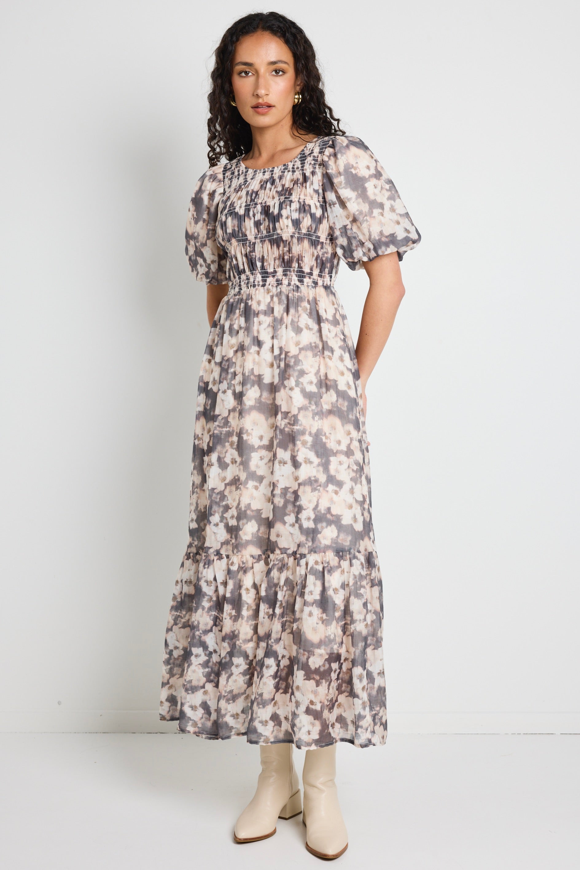 Vacancy Chocolate Floral Puff Sleeve Shirred Maxi Dress